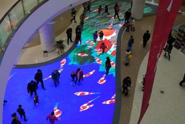 洪海智能光電公司在山東臨沂齊魯園制作的室內(nèi)異形LED互動地磚屏,剛一安裝完工就引起了群眾們極大的反響。此LED互動地磚屏的總面積達(dá)到136平方米,用以p6.25的像素,安裝在齊魯園室內(nèi)的地面上,從其外觀造型的角度講,該地磚屏類似于陰陽太極圖上的陰陽魚,具有招風(fēng)水的美好寓意;而從功能技術(shù)上講,該地磚屏具有承重性、防護(hù)性、散熱性以及互動性,然而其中較數(shù)互動性最具創(chuàng)意感,是根據(jù)捕捉人的活動軌跡展現(xiàn)出互動的效果,從而呈現(xiàn)出足下生花之感,依此達(dá)到人屏合一的感觀效果。