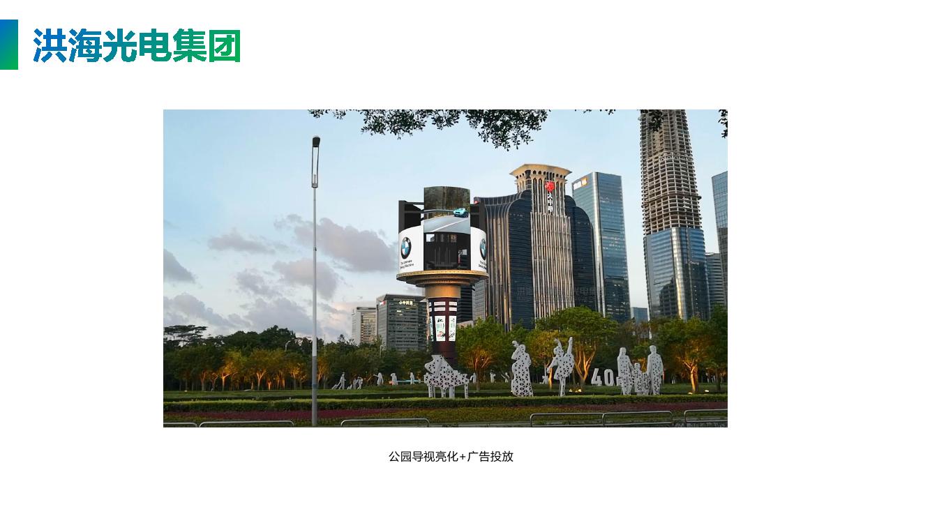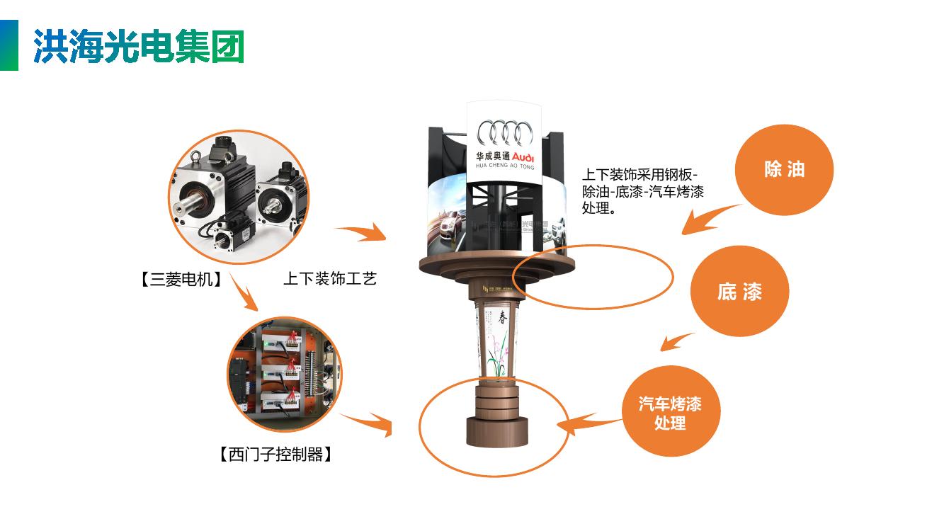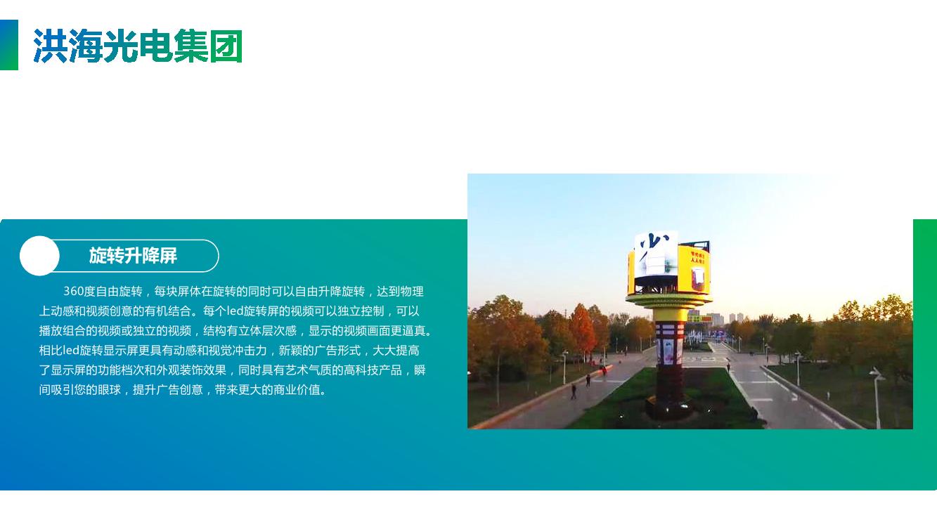 洪海光電集團有限公司 是一家專業致力于智能景觀動態LED顯示屏的研發,以智能機器人高端宣傳設備為研究方向,我們將機器人的機械運動美學和LED智能顯示相結合,創造出系列智能廣告和展示設備,實現顯示屏的旋轉升降、伸縮、變形、無線傳輸、遠程控制、人機互動等現代智能化元素,為智慧城市提供全套的城市景觀、戶外廣告、機械幕墻配套的技術服務方案。 總工程師史洪海先生獲200多項國家專利,是受聘于中國青年創業國際計劃的青年創業導師和大學產業教授,在中國智能光電行業中具有非凡的創造力和舉足輕重的地位。